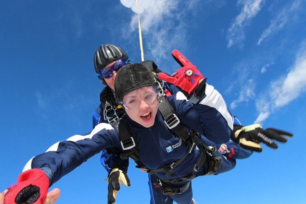 Under fallskärmshoppet sitter du tryggt fastspänd vid din tandeminstruktör som sköter allt.